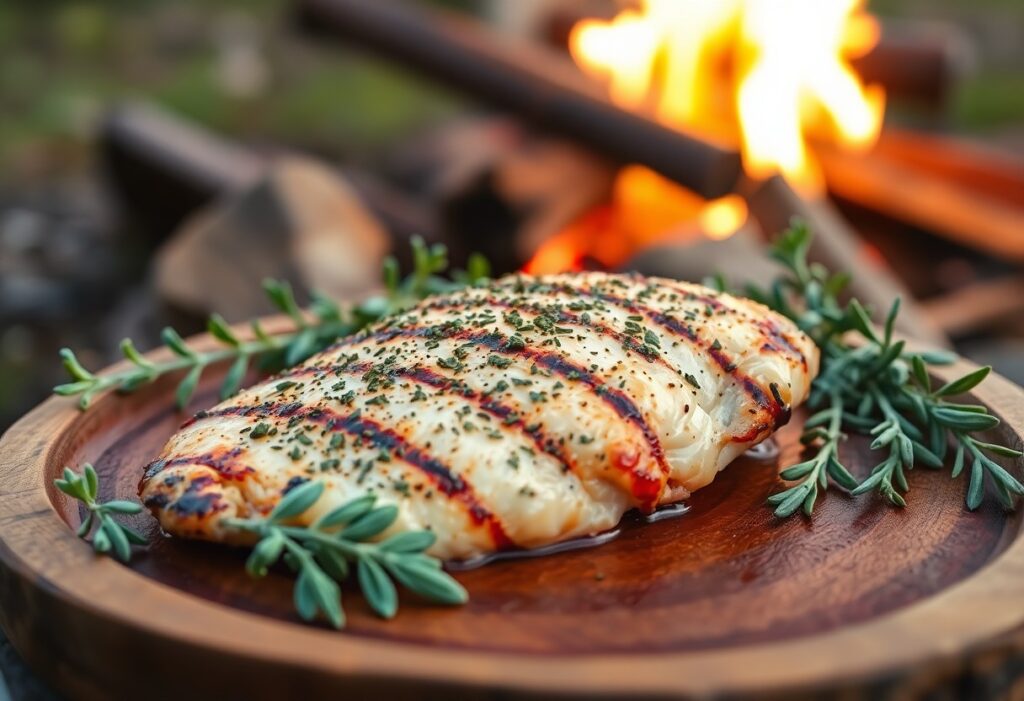 When you’re ready to grill, begin by preparing your garlic-herb rub. In a medium bowl, mix the olive oil, dried thyme, garlic powder, salt, and black pepper. This mixture not only keeps the chicken moist as it cooks over the campfire but also infuses each bite with a robust mix of flavors. You’ll love how simple it is to whip up this rub right at your campsite.