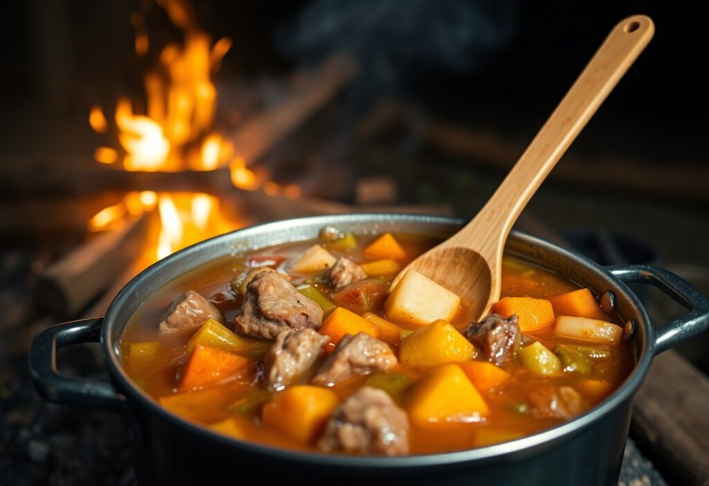 After you’ve decided on your ingredients, focus on assembling vital camp equipment. You’ll need a sturdy, heavy pot or Dutch oven that can withstand the heat of the coals, as well as a reliable heat source for simmering your stew at the recommended temperature of 300°F for 2-5 hours. Pack a long-handled spoon for stirring to ensure that flavors meld together beautifully and a reliable knife for chopping the root vegetables into bite-sized pieces. By being well-prepared, you’ll set the stage for a successful cooking experience that leaves everyone satisfied.