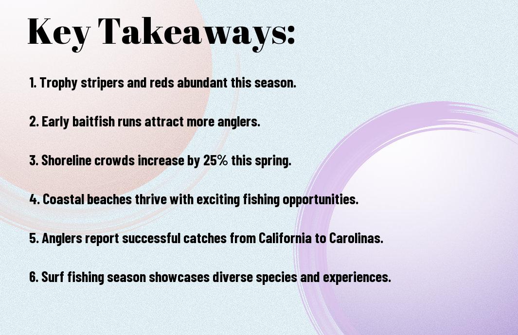 Presently, the spring surf fishing season captivates anglers along coastal beaches, as they report exciting catches of trophy stripers and reds, driven by early baitfish runs and increased shoreline activity. They find that the surge in both fish and fishing enthusiasts enhances the coastal experience, making it an unforgettable season for many. For those interested in specific techniques and baits, resources like Spring Surf Fishing for Drum offer valuable insights to maximize their fishing adventures.